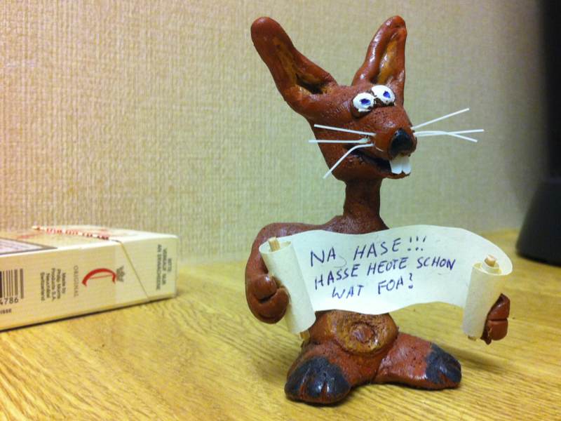 The rabbit is made out of polymer clay with a steel wire skeleton, the whiskers are taken from a dish washing brush and the teeth are made out of a piece of a yogurt plastic cup.